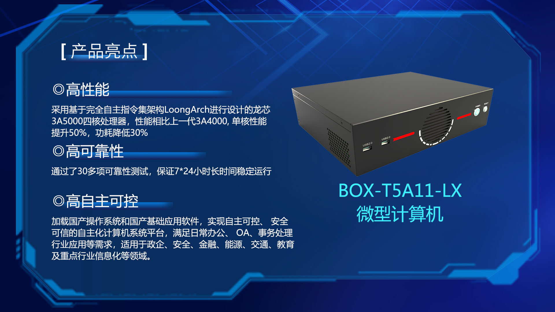 研恒(特控)BOX-T5A11-LX微型計(jì)算機(jī)采用基于完全自主指令集架構(gòu)LoongArch進(jìn)行設(shè)計(jì)的龍芯3A5000四核處理器,性能相比上一代3A4000, 單核性能提升50%,功耗降低30%,指令集系統(tǒng)架構(gòu)承載的軟件生態(tài)走向完全自主。整機(jī)采用純工業(yè)設(shè)計(jì),通過了30多項(xiàng)可靠性測試,保證設(shè)備7*24小時長時間穩(wěn)定運(yùn)行。配套國產(chǎn)BIOS,加載國產(chǎn)操作系統(tǒng)和國產(chǎn)基礎(chǔ)應(yīng)用軟件,實(shí)現(xiàn)自主可控、 安全可信的自主化計(jì)算機(jī)系統(tǒng)平臺,滿足日常辦公、 OA、事務(wù)處理,行業(yè)應(yīng)用等需求,適用于政企、安全、金融、能源、交通、教育及重點(diǎn)行業(yè)信息化等領(lǐng)域。