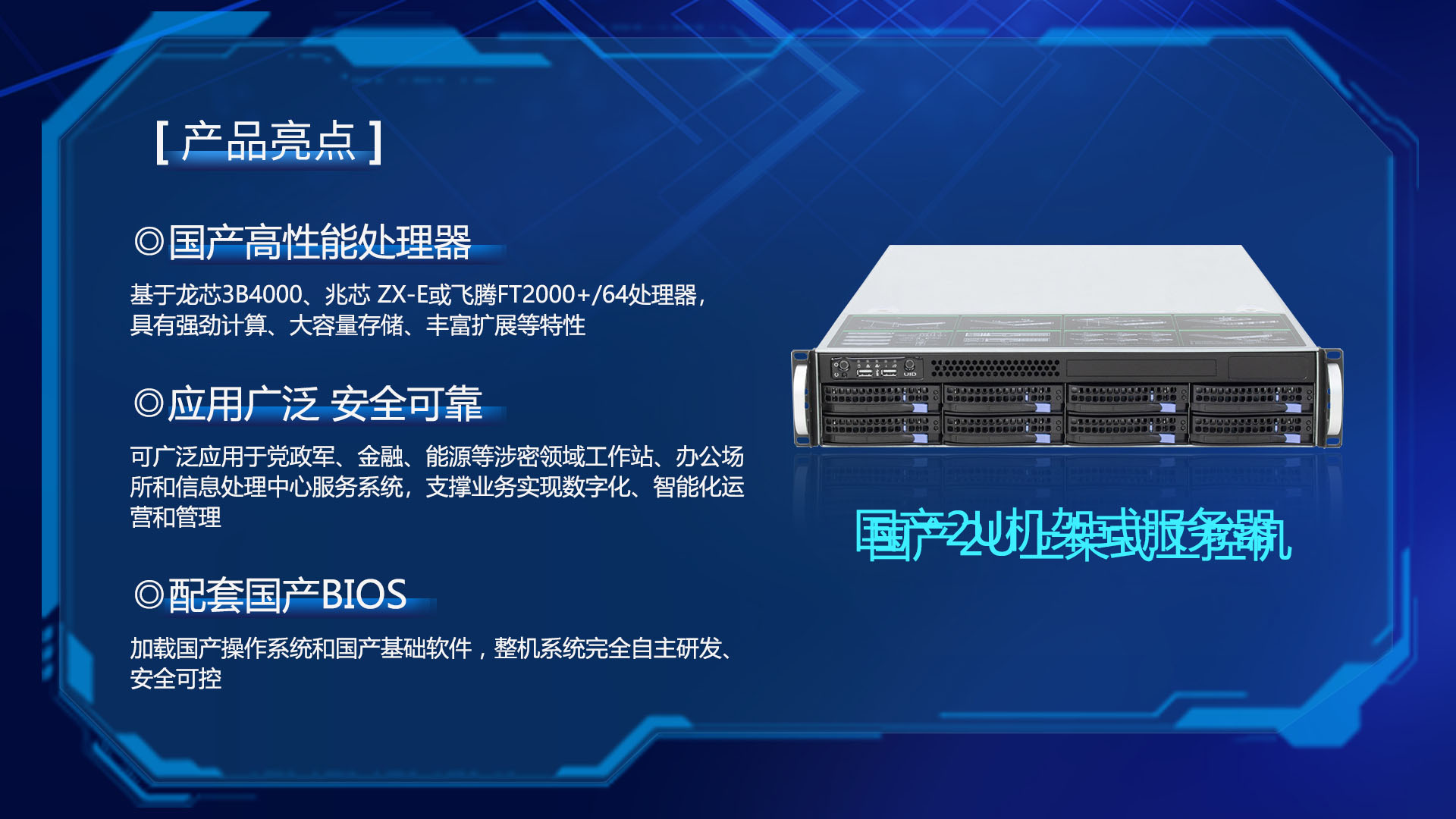 研恒(特控)國產(chǎn)2U機(jī)架式服務(wù)器基于龍芯3B4000、兆芯 ZX-E或飛騰FT2000+/64處理器,具有強(qiáng)勁計(jì)算、大容量存儲、豐富擴(kuò)展等特性,配套國產(chǎn)BIOS, 加載國產(chǎn)操作系統(tǒng)和國產(chǎn)基礎(chǔ)軟件,整機(jī)系統(tǒng)完全自主研發(fā)、安全可控??蓮V泛應(yīng)用于黨政軍、金融、能源等涉密領(lǐng)域工作站、辦公場所和信息處理中心服務(wù)系統(tǒng),支撐業(yè)務(wù)實(shí)現(xiàn)數(shù)字化、智能化運(yùn)營和管理。