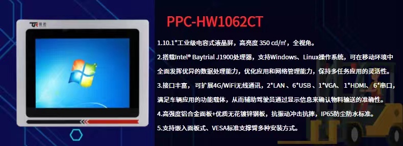 PPC-HW1062CT是一款x86多核10.1寸寬屏電容觸摸式無(wú)風(fēng)扇工業(yè)平板電腦,采用穩(wěn)定的BayTrail平臺(tái)J1900四核處理器,除了擁有鋁合金壓鑄一體成型的堅(jiān)固外殼外,還能實(shí)現(xiàn)整機(jī)IP65防水和抗接觸式6Kv電磁干擾。采用工業(yè)標(biāo)準(zhǔn)的LAN、VGA、USB、串口等多元接口,極大符合了工業(yè)級(jí)應(yīng)用,并能進(jìn)行模塊化擴(kuò)展、4G和WiFi等功能,加上嵌入面板式、VESA靈活安裝方式,符合以物料、叉車(chē)、現(xiàn)場(chǎng)巡檢等工業(yè)現(xiàn)場(chǎng)、港口及戶外應(yīng)用環(huán)境。