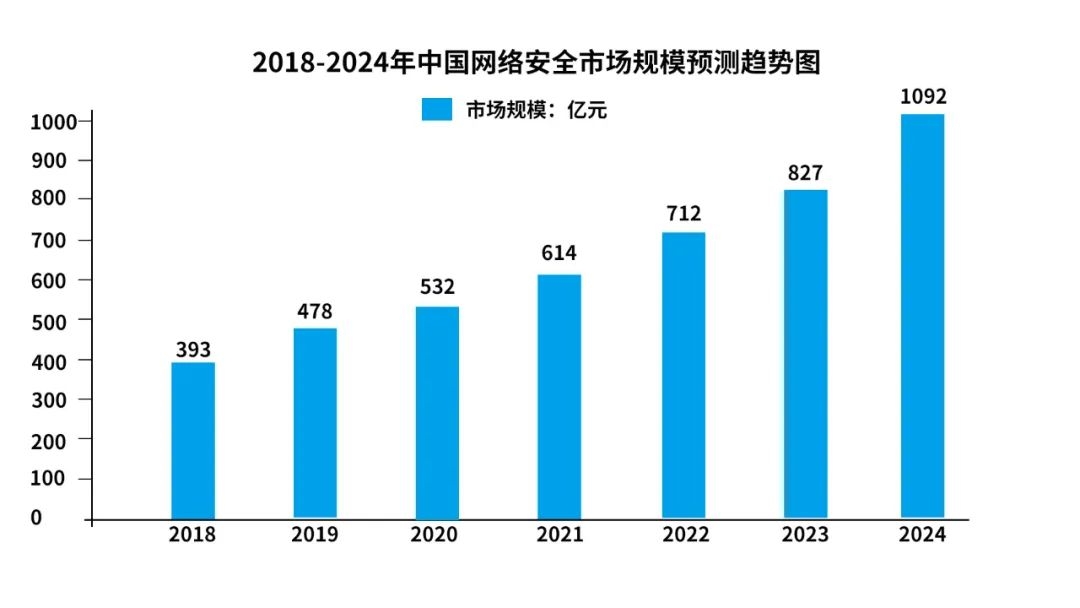 當(dāng)前,網(wǎng)絡(luò)安全戰(zhàn)略已成為各國競爭與發(fā)展戰(zhàn)略的重要一環(huán),我國網(wǎng)絡(luò)安全政策環(huán)境也在持續(xù)優(yōu)化,加上企業(yè)和個人數(shù)字化需求不斷攀升,我國網(wǎng)絡(luò)安全市場持續(xù)擴大。根據(jù)中國網(wǎng)絡(luò)安全產(chǎn)業(yè)聯(lián)盟數(shù)據(jù),2022年我國網(wǎng)絡(luò)安全市場規(guī)模約712億元,預(yù)計未來增速仍將保持在15%以上,到2024年市場規(guī)模將達到1092億元。