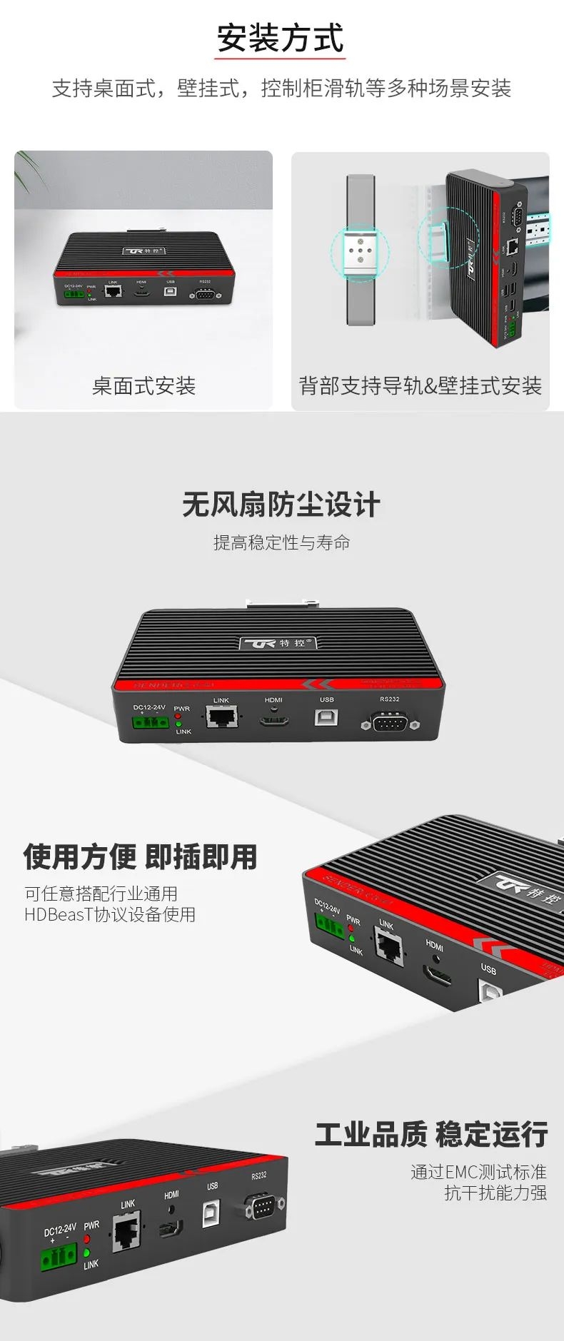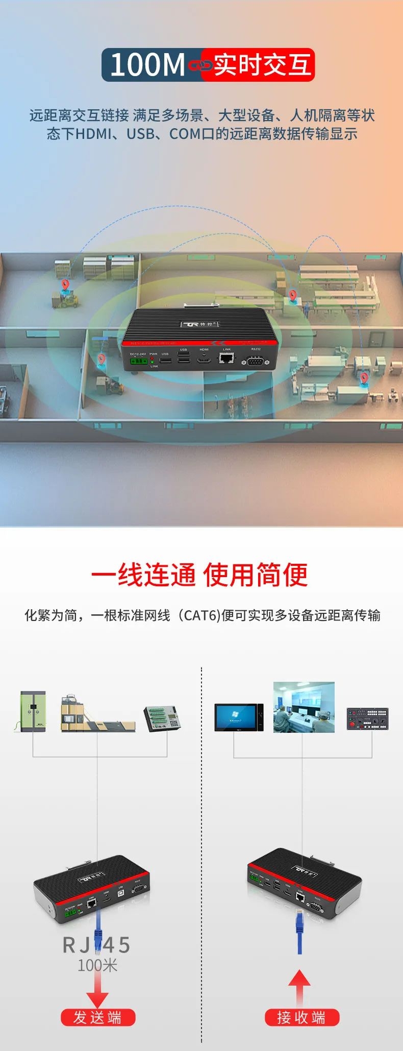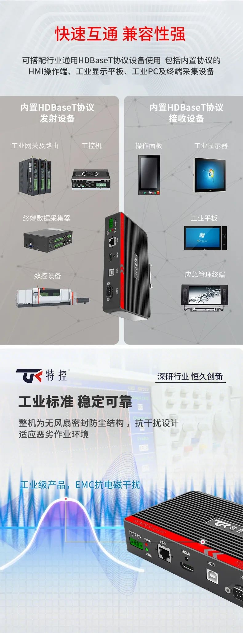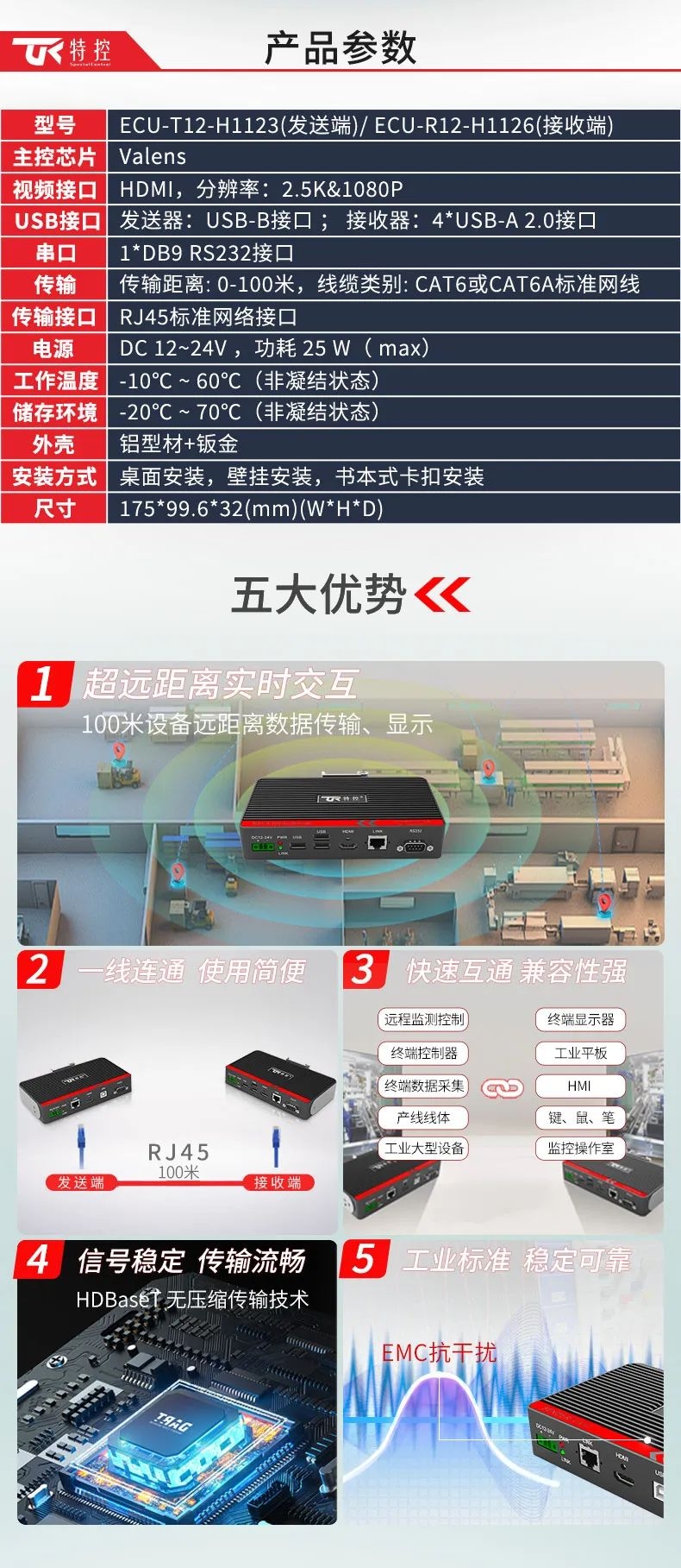 在大型裝備、自動(dòng)化產(chǎn)線、激光及數(shù)控行業(yè)等需要遠(yuǎn)距離信號(hào)傳輸場(chǎng)景中,傳統(tǒng)HDMI線纜存在信號(hào)衰減、傳輸距離限制、布線不便等問(wèn)題,這極大地影響顯示端的成像質(zhì)量和雙向數(shù)據(jù)的穩(wěn)定性和時(shí)效性。為此,特控研發(fā)出抗干擾性強(qiáng)、數(shù)據(jù)零延時(shí)、兼容性強(qiáng)的HDMI星光遠(yuǎn)傳ECU-TR12。特控ECU-TR12采用進(jìn)口高性能芯片設(shè)計(jì),總體由發(fā)射端T12和接收端R12兩部分組成,發(fā)射端可將2.5k高清視頻信號(hào)、USB和RS232數(shù)據(jù)信號(hào)進(jìn)行整合,通過(guò)標(biāo)準(zhǔn)網(wǎng)線(CAT6)遠(yuǎn)距離傳輸?shù)浇邮斩?,無(wú)信號(hào)衰減,接收端通過(guò)高性能智能芯片解碼,可以給用戶高速高質(zhì)量的數(shù)據(jù)及顯示交互體驗(yàn),整機(jī)外殼采用鋁合金散熱設(shè)計(jì),機(jī)身堅(jiān)固小巧獨(dú)具工業(yè)美感,可搭配行業(yè)通用HDBeasT協(xié)議設(shè)備使用,包括內(nèi)置協(xié)議的HMI操作端、工業(yè)顯示平板、工業(yè)PC及終端采集設(shè)備。